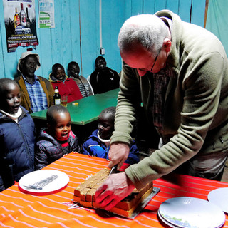 āS avonds hebben we Klaas zijn verjaardag gevierd. Er was speciaal voor ons een geit geslacht en geroosterd. Nomachoma (Keniaanse BBQ) noemen ze dat. Het menu werd aangevuld met rijst, meerdere soorten aardappelen, ugali (maispuree) en allerlei groentes. Prachtig geserveerd als een soort lopend buffet. Er waren circa 40 gasten uitgenodigd. Er was zelfs een verjaardagstaart geregeld, wat een verrassing! Die moest in kleine stukjes worden gesneden en uitgedeeld aan alle gasten, onder het gezang van alle kinderen. Zeer indrukwekkend!